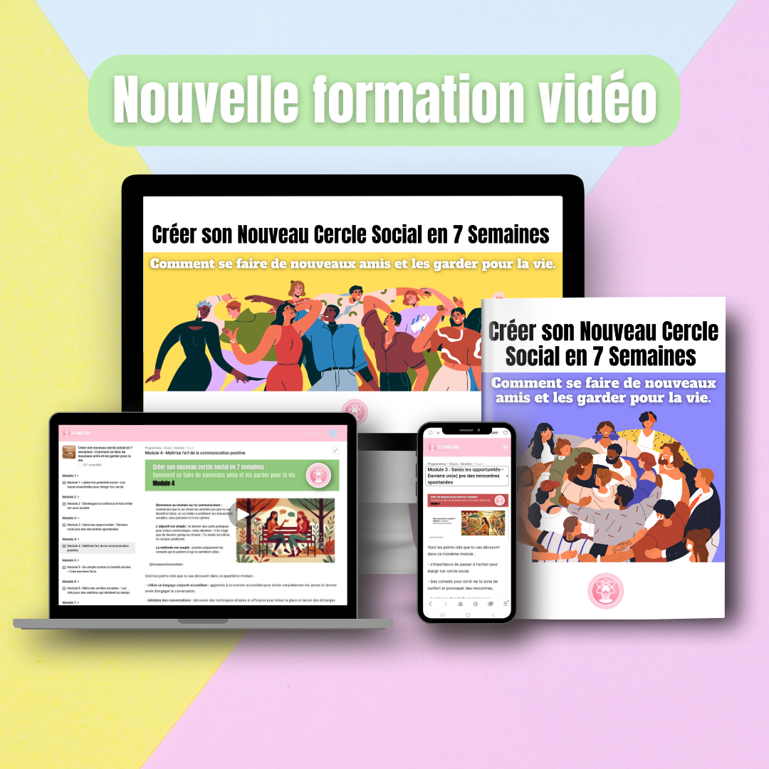 Tu te sens seul(e) et tu aimerais te créer un véritable cercle d'amis ? Cette formation complète te donne toutes les clés pour développer des relations sociales épanouissantes, même en partant de zéro. Découvre les secrets d'une communication efficace, les meilleurs endroits pour faire des rencontres et les techniques pour développer ton "aura sociale" qui attirera naturellement les bonnes personnes vers toi.